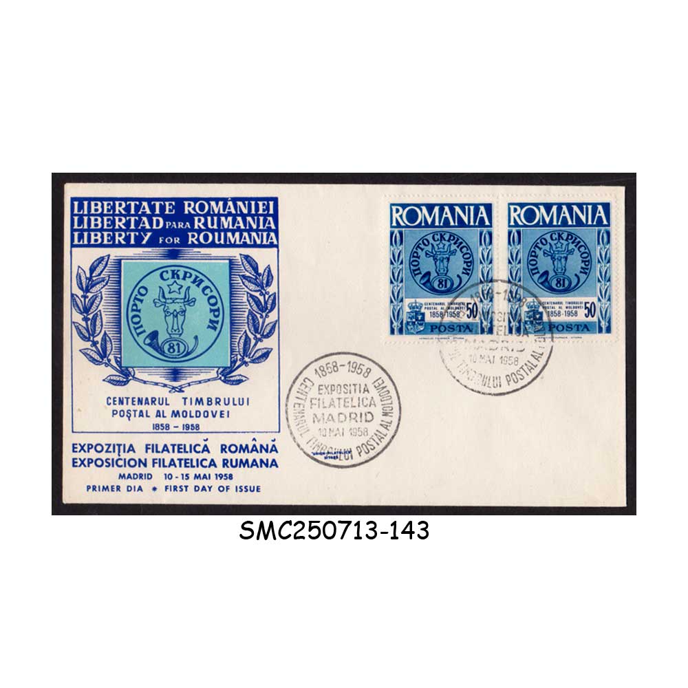 ROMANIA – 1958 CENTENARY OF MOLDOVIAN STAMPS PHILATELIC EXHIBITION, MADRID FDC