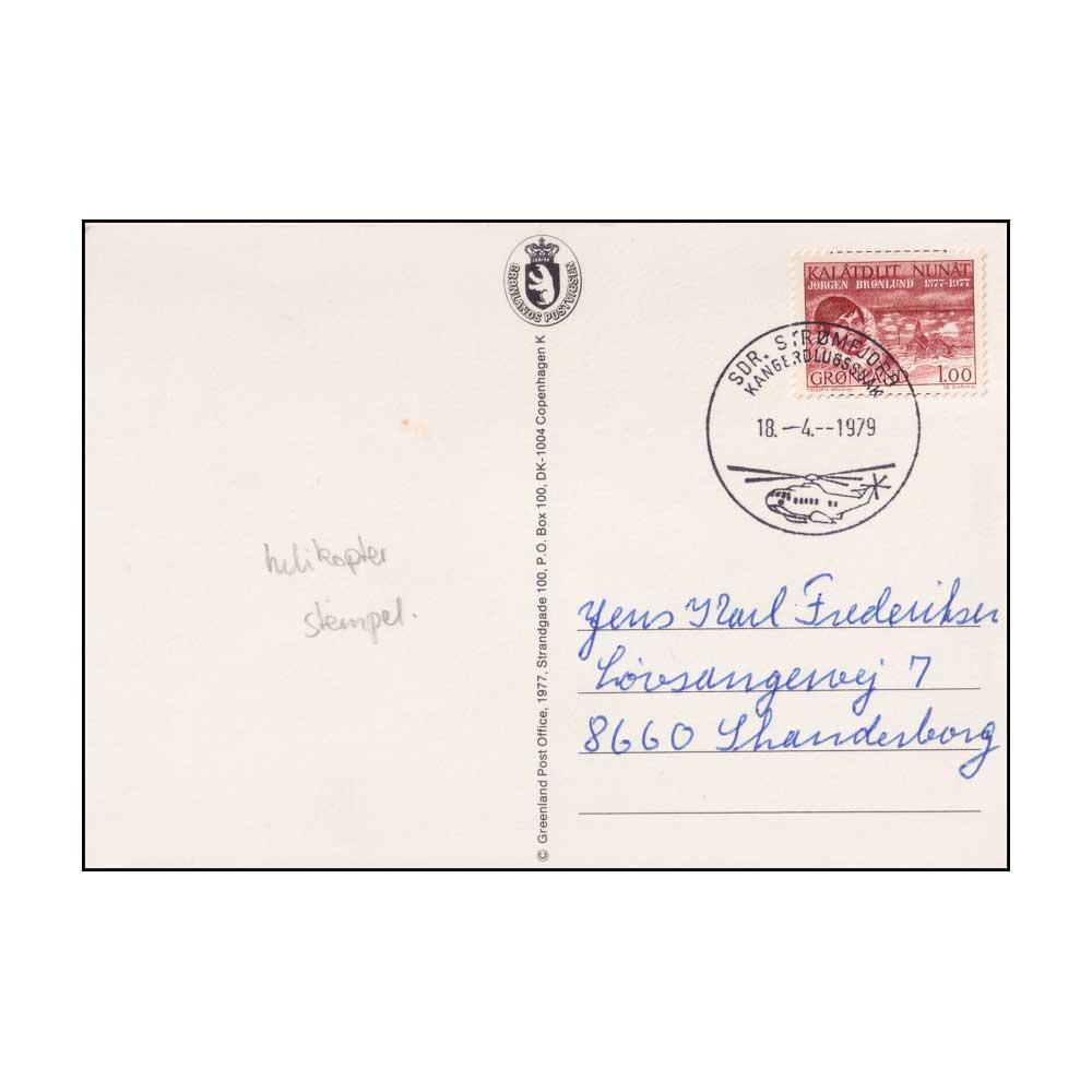 Postcard from GREENLAND 1979 PICTURE POSTCARD WITH HELICOPTER CANCELLATION