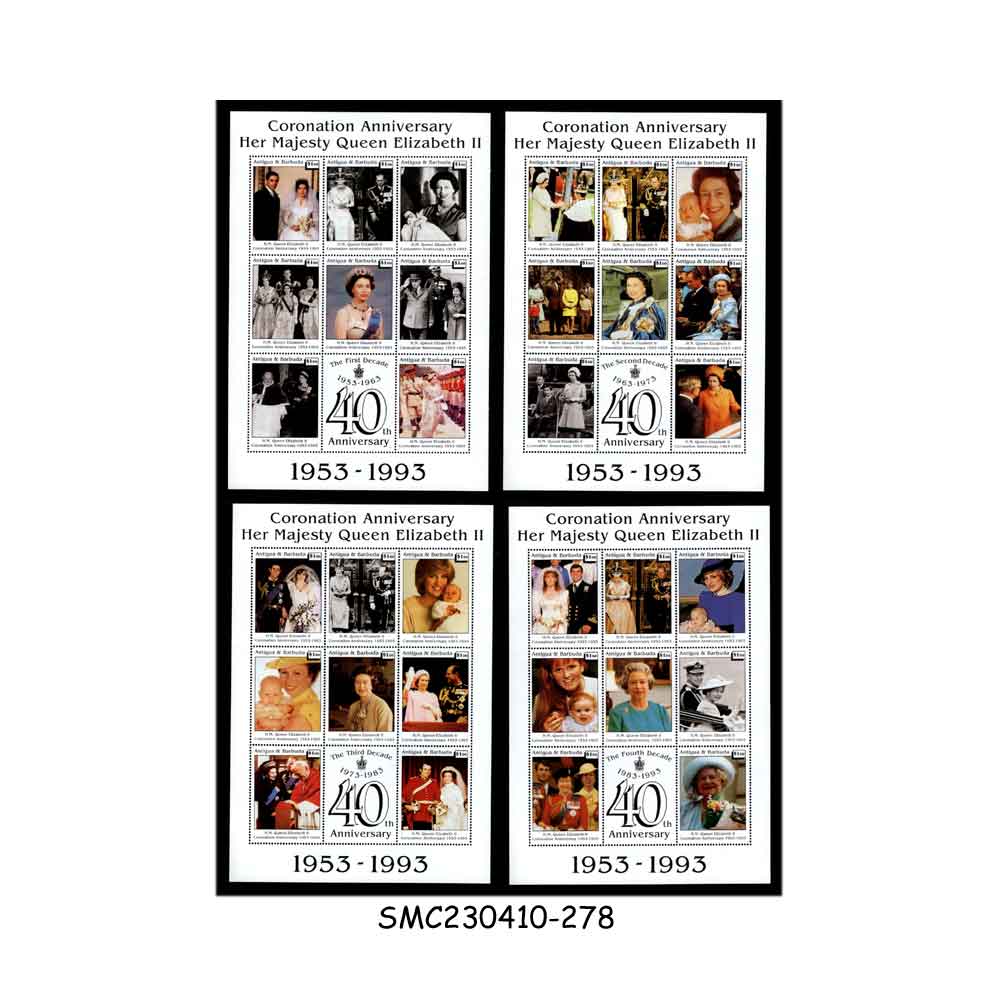 ANTIGUA & BARBUDA – 1993 40th ANNIVERSARY OF QEII CORONATION – SET OF 4 MIN. SHEET MINT NH
