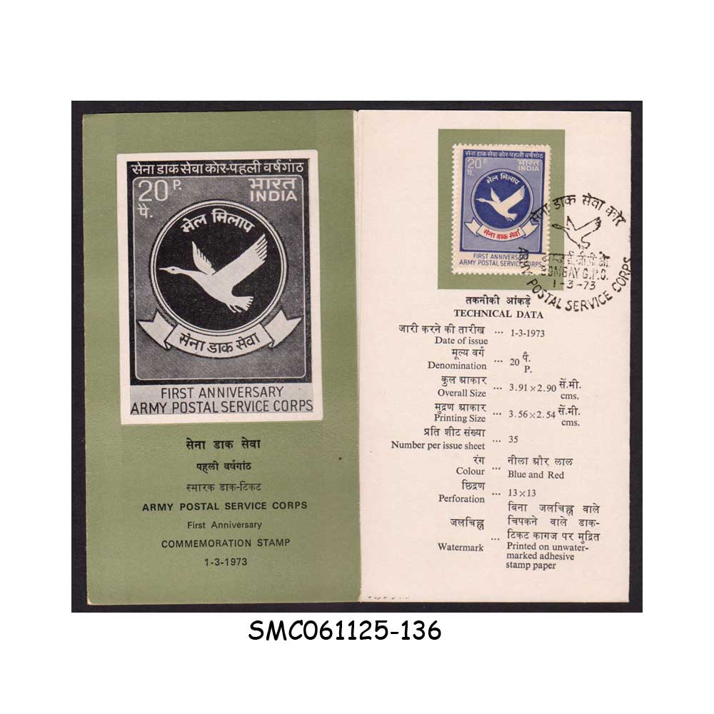 Stamps from INDIA – 1973 1st ANNIVERSARY OF ARMY POSTAL SERVICE CORPS – BROCHURE – FDI