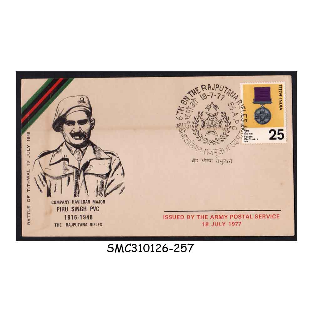 Stamps from INDIA – 1977 6th BN THE RAJPUTANA RIFLES / PURU SINGH PVC COVER ISSUED BY INDIAN ARMY POSTAL SERVICE